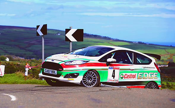 (Photo: John MacCrone drives the Castrol-liveried, M-Sport Ford Fiesta R200 through the stages of the Manx National Rally. FiveStageMedia)
